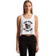 Curved hem, racer back detail, self-fabric binding at neck and armholes